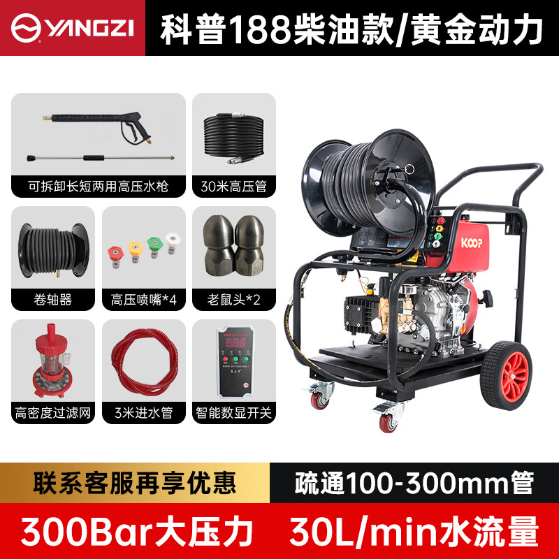 一臺(tái)揚(yáng)子YZ-D30-30柴油款管道疏通機(jī),動(dòng)力強(qiáng)水流大暢通無阻拐彎無壓力。